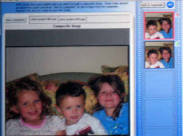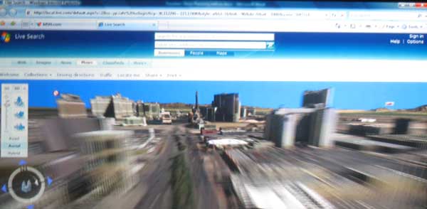| Microsoft showed a new "Live" program that lets you use your XBox game controller to fly through cities. The images come from satellite images, much like Google's maps. The second picture to the right shows how Vista lets you easily combine the photos from two different shots into one. This way, if someone is blinking during one shot you can substitute the face (eyes) from another shot. Photoshop can do this with some effort, but not automatically like Vista. |
