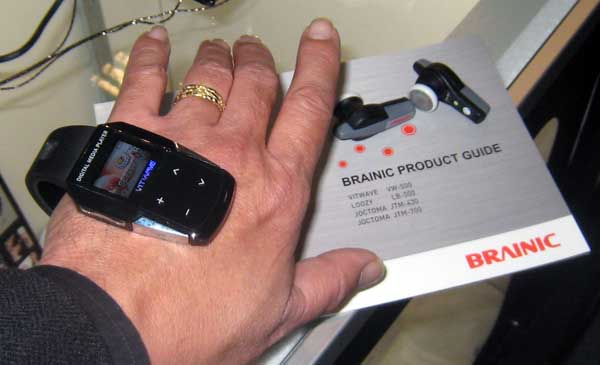 | Brainic plans to introduce their VIT Wave this summer. It is an MP3 player with display that "clips" onto your hand. Bluetooth wireless ear buds let you listen to the music while vibrations from the music are felt on your hand. $160. |