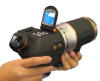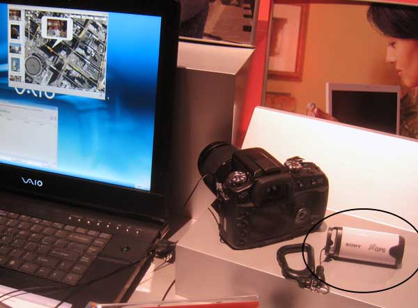| Sony also shows a refreshed version of their GPS Image Tracker. The GPS unit (circled in lower right) takes a reading every 10 seconds. Readings are stored and transferred to your PC. The photos also have time stamps. A comparison lets software show the photo you took and where in the world you were when it was taken. Of course, one needs to make sure the GPS can read the satellites - an issue for indoor photos. |