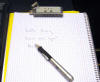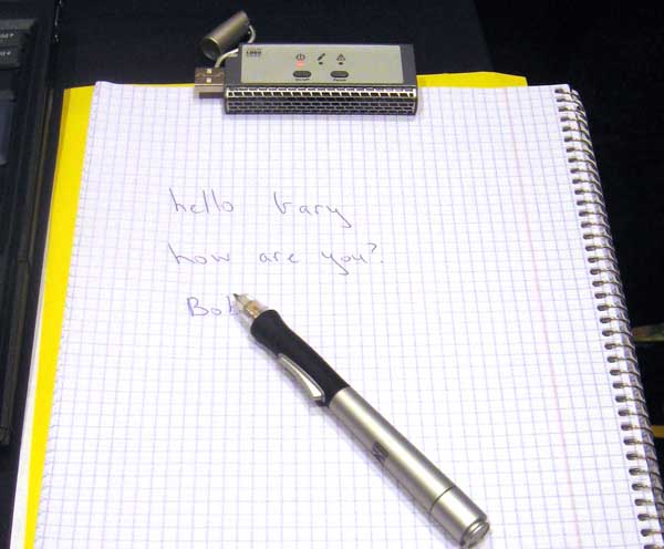 | EPOS makes technology that can be used to make an electronic pen. The device clipped to the top of the pad reads the pen as you write. You unclip that device and plug it into a USB slot and download the "ink", apply handwriting software and get your text file. An un-named company will be introducing one in Q2 for $80. |  |