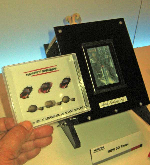 | Hitachi showed a clever way to make autostereoscopic (3D) displays that don't need special glasses. Two LCD planes are spaced about 7mm apart and the same image is shown on both. However, parts of the image that are closer to you are brighter on the front LCD, while objects that are far away are brighter on the 2nd LCD. Works pretty good if you are directly in front. Look closely at the paper prop to perhaps get an idea. First use? Pachinko machines. |  |
