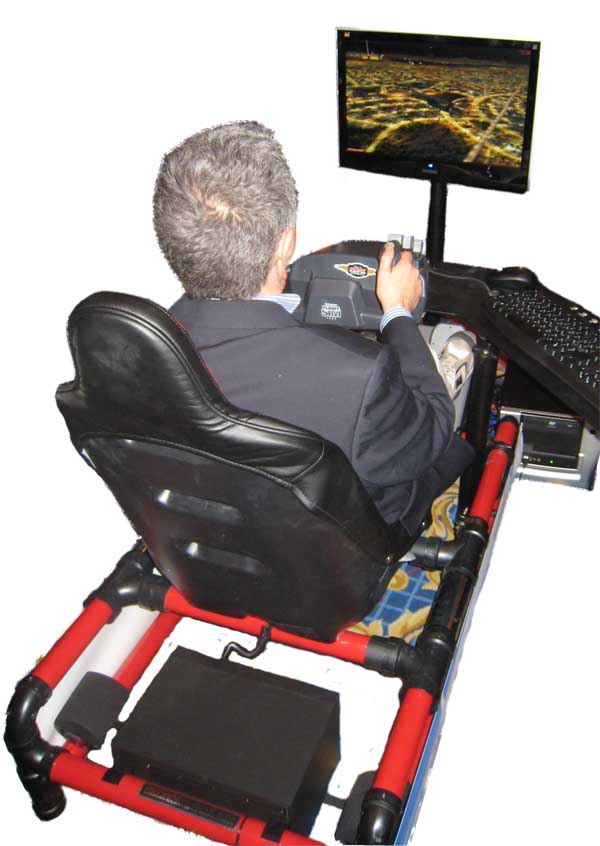 | Hotseat Flight Sim is the ultimate flight simulator or race car driver gamer. $3,954 gets you the PC, chair, 5.1 sound with subwoofer under your seat, Microsoft Flight Simulator 10, display, steering wheel and foot controls. |