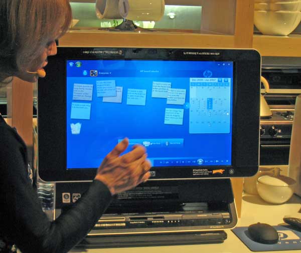 | HP is moving back into its comfort zone with PC oriented products. Here we have the TouchSmart PC, intended for the kitchen as a family organizer. While a keyboard can be used, family management features are accessed via the touch screen. $1799, end of January when Vista is released. |