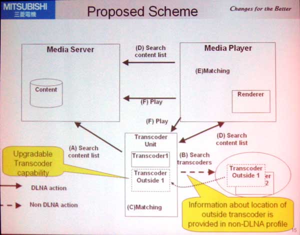 | Mitsubishi proposes a way for devices to exchange media using formats not previously defined by DLNA. A Mfr. could define a new media format and have devices go to that Mfr's website to download new transcoding software without the consumer knowledge. |