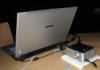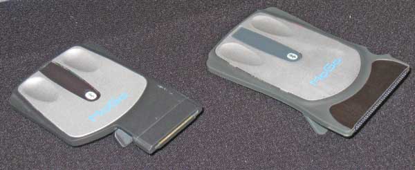 | A very clever pair of mice from MoGo for the notebook traveler. They fit into the peripheral slot (e.g. PCMCIA or ExpressCard/54) for storage and charging. They pop out and up to be your Bluetooth wireless mouse. Somewhat comfortable, but cool design. The newer (left) model comes out Q2 for $79.99. It features a scroll bar, too. A very small $49.99 Bluetooth dongle will also be available. |