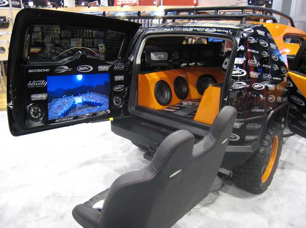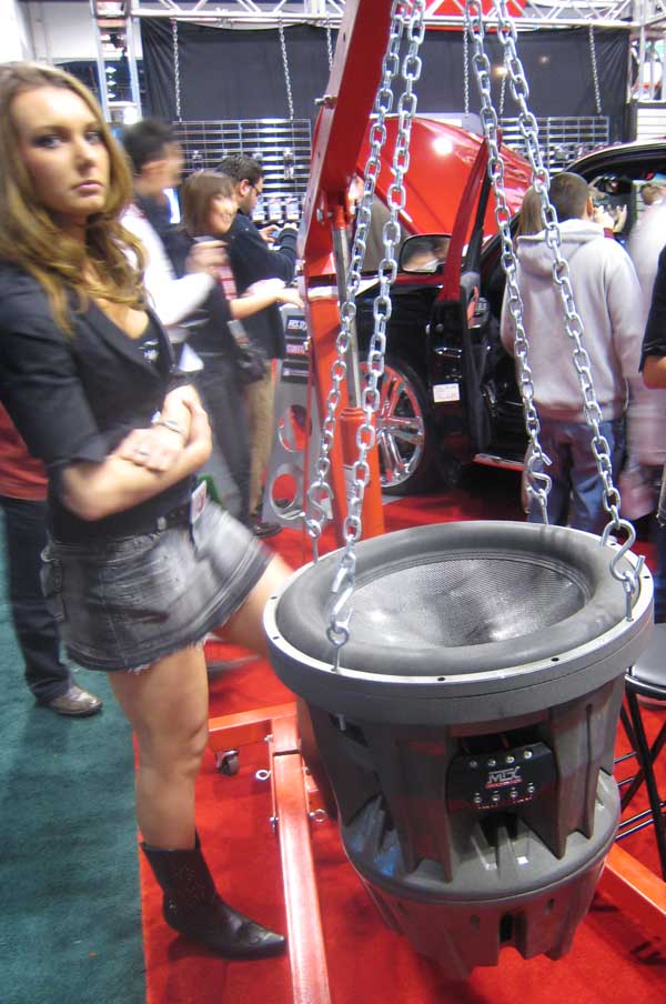 | A quick walk around the "mobile electronics" area discovered a new home theater format - the back of your Toyota SUV. Scosche showed this demo show car. MTX Audio had their own demonstration car, but the speaker in the second photo was what caught our eye. |