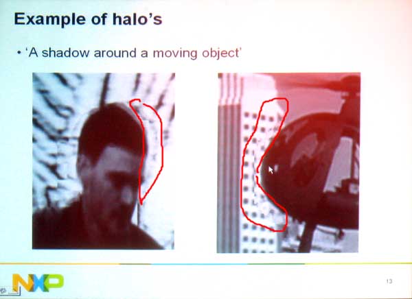 | NXP (formerly Philips Semiconductors) explained improved frame rate conversion (FRC) process used for 24 fps to 60 fps (3:2) conversion. Frame interpolation is used to create a smoother progression of images, but "halos" (red outlined areas in photo) result due to missing image data. NXP uses motion estimation to reduce this problem. |
