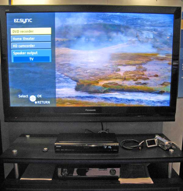| Panasonic demonstrated EZsync, a way to control multiple devices that are connected via HDMI. Other vendors were also talking about their versions, which tended to be given proprietary names. While this control protocol is a standard, companies tend to use the standard's flexibility to add proprietary extensions. Thus, while you should be able to control a brand B device via a brand A remote, the proprietary elements get in the way. |