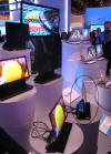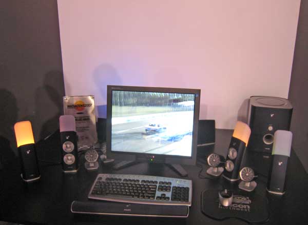 | Taking their Ambi theme a step further, Philips showed their AMBX game peripheral system. Look closely and you see that environmental lights glow with the mood of the game, while fans blow air on you as required by explosions and speeding cars. A rumble wrist pad is included. The premium kit is $399. Next year they will have vest you wear that lets you know you've just been tackled in a football game (no joke). |