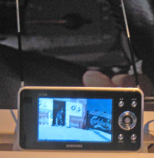 | One of the more intriguing technologies that Samsung talked about is what they call A-VSB. U.S. digital television uses 8-VSB modulation which has very poor mobile performance compared to Europe's standard. A-VSB works over existing DTV broadcast equipment, but uses about 30% of the bit stream to send a training signal and a forward error correction (FEC) signal. The training signal helps to tune the receiver's equalizers while the FEC fixes the rest. The photo on the left shows before and after images while the photo on the right is a prototype receiver. The system is in development, but one can see implications for some alternative cellular-based TV mobile services. |  |