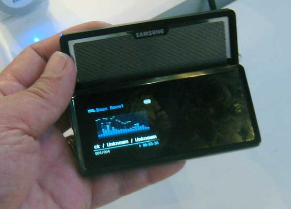 | The Samsung K5 lets you get out of the "ear bud bubble" by playing your MP3 out loud. The speaker panel (rear panel) fold away when not used. The K5 sells for $199 and up, depending on memory. |