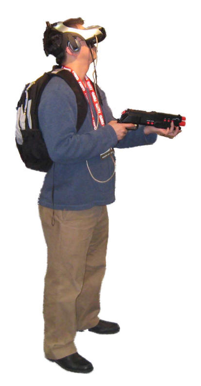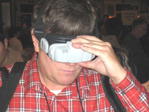 | Does this guy look a little clueless? If you like shoot-em up games with immersion glasses, look at Trimersion. This product comes out in February for $395. |