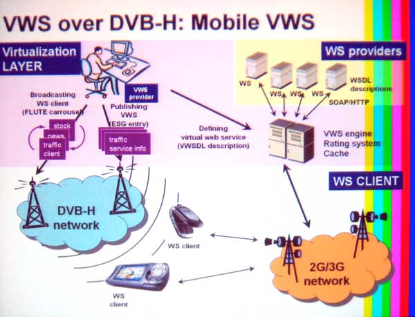 | Ana Vilas, et al, Univ of Vigo, Spain, explained a way to combine several similar web services into one virtual web service accessible via DVB-H. One example is to display traffic information to drivers. |
